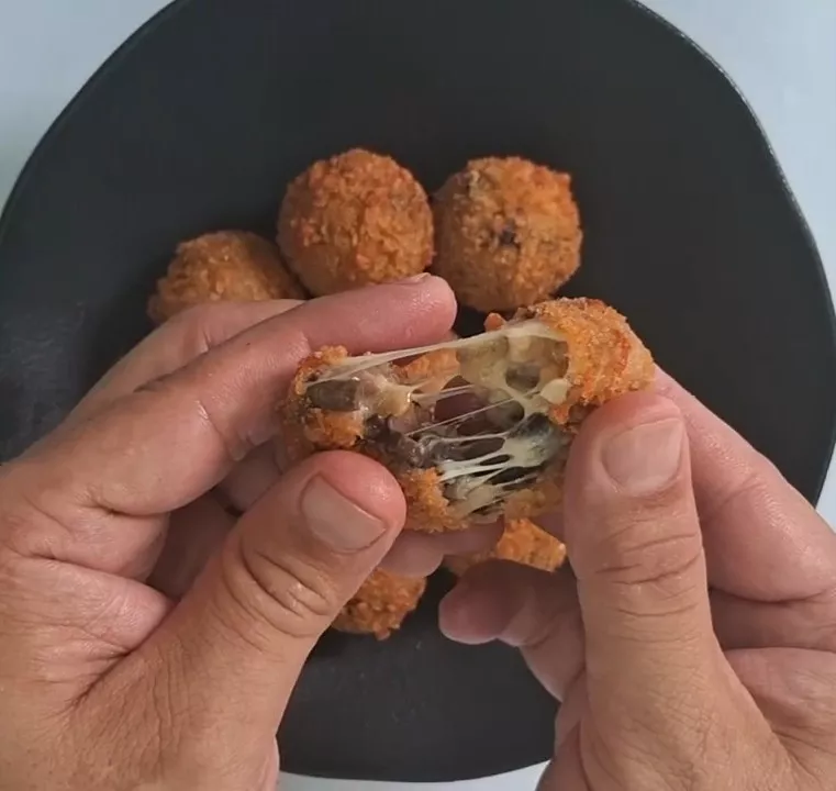 “Este bolinho de risoto italiano tem lugar garantido entre os petiscos brasileiros. Esta versão com cogumelos e mussarela é simplesmente incrível”